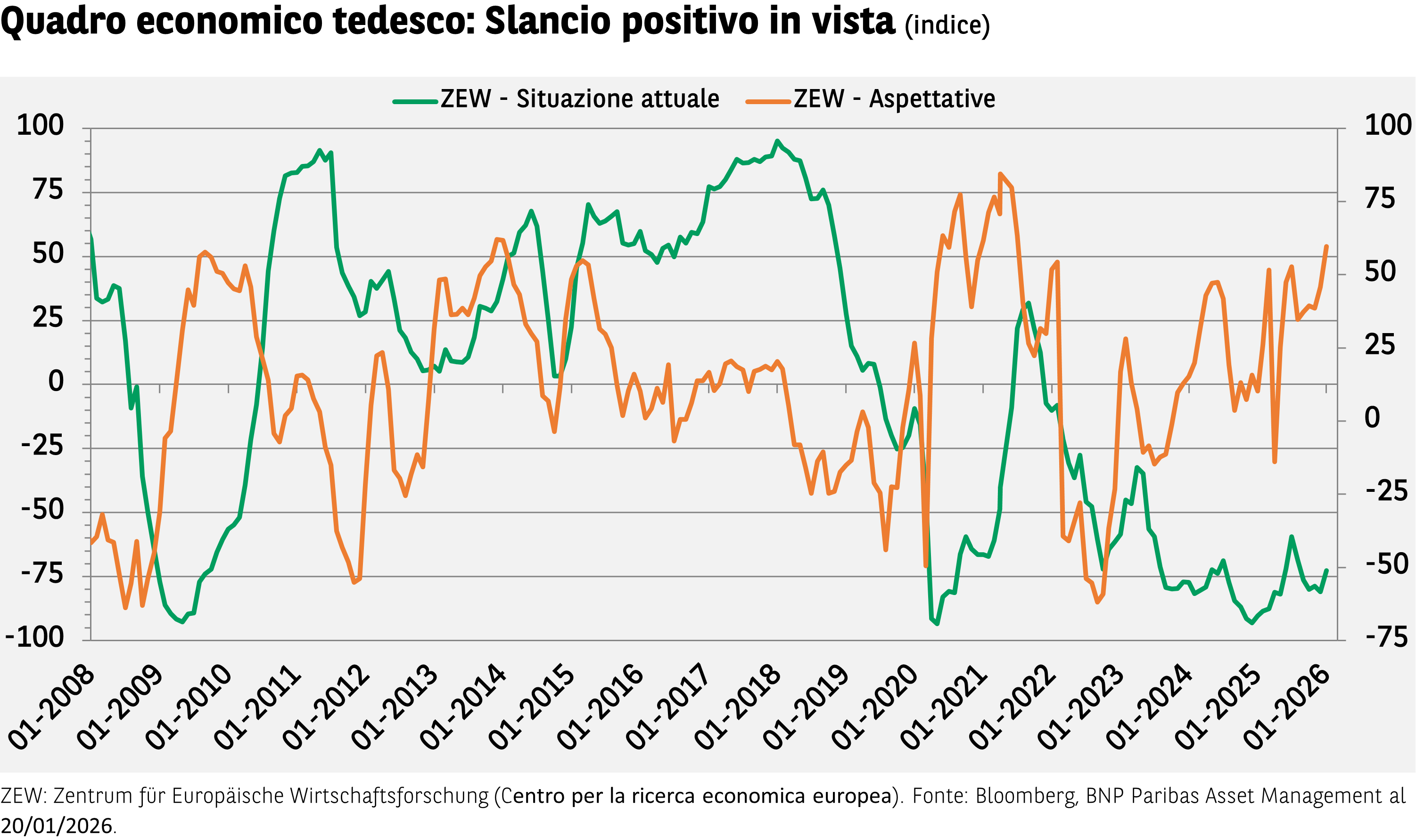 L’indicatore ZEW del sentiment economico, un’indagine condotta tra analisti finanziari e investitori tedeschi, è notevolmente aumentato a gennaio, toccando il livello più alto dal luglio 2021. Questa progressione fa sperare in un “nuovo slancio”, alimentato dai massicci piani di spesa della Germania per le infrastrutture e la difesa. Gli ordini sono in rialzo e la produzione industriale alla fine del 2025 si è rivelata di molto superiore alle attese. Anche la valutazione dell’attuale quadro economico è migliorata, sebbene in misura più modesta, ma è comunque incoraggiante. È giunto il momento di avere più fiducia nel potenziale della Germania?
