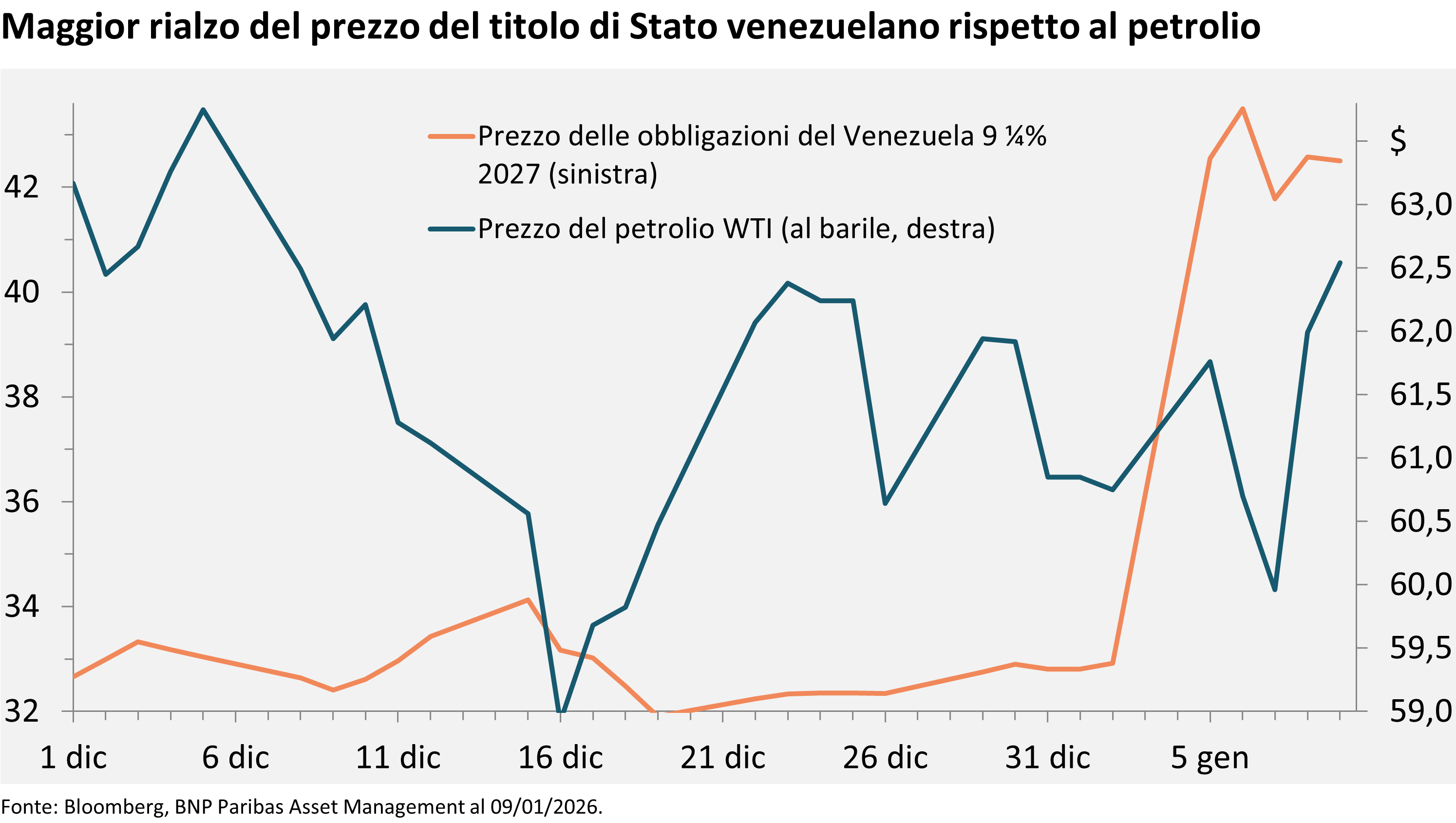 Gli investitori hanno ricevuto una sorpresa di Capodanno con l'arresto del presidente venezuelano Nicolás Maduro ad opera degli Stati Uniti. La reazione del mercato alla notizia è stata ampiamente positiva. I prezzi delle azioni delle principali compagnie petrolifere statunitensi sono aumentati e i titoli di Stato venezuelani hanno registrato un netto rialzo. I prezzi del petrolio hanno registrato una forte volatilità, con l'interruzione dell'approvvigionamento a breve termine e rischi geopolitici che contrastano con le aspettative di un aumento dell'offerta che potrebbe derivare dagli investimenti statunitensi nel settore. Sebbene il Venezuela possieda le più grandi riserve petrolifere al mondo, la sua produzione è relativamente limitata. Vent'anni fa, la produzione ha raggiunto il picco di tre milioni di barili al giorno, mentre oggi è inferiore a un milione. Il ritorno al livello precedente, che non sarebbe immediato, comporterebbe solo un aumento del 2% della produzione globale totale.