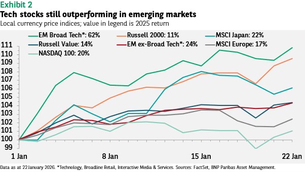 In emerging markets (EM), however, this has not been the case. It is important to recognise that the technology sector has been as important a driver of EM performance as it has been in the US. The gap between the performance of tech and non-tech sectors in emerging markets in 2025 was even greater than that between the Nasdaq 100 and Russell Value, with EM tech beating non-tech EM by nearly 40ppt.