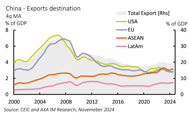 By contrast, Chinese exports have maintained a good momentum, particularly since the second quarter of this year. This in part stemmed from front-loading demand, as foreign importers sought to avoid potential higher tariffs on Chinese goods as the US, the European Union, Canada and Indonesia all raised tariffs on Chinese goods in 2024. However, Trump’s return to the White House once again threatens a more hostile external environment for China.