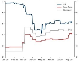 La ripresa dei tagli dei tassi da parte della Fed, a fronte delle preoccupazioni sul mercato del lavoro, ha portato a un rinnovato interesse per gli asset rischiosi. Tuttavia, il deterioramento dei dati economici in Europa, le preoccupazioni fiscali nei paesi sviluppati, il rallentamento del mercato del lavoro americano e il rischio geopolitico, con l'intensificarsi delle provocazioni russe nei confronti della NATO, costituiranno inevitabilmente fonti di preoccupazione per le prossime settimane. Molta attenzione dei mercati si concentrerà sulla pubblicazione dei risultati trimestrali. Si cercherà soprattutto di capire quali sono i potenziali impatti dei tassi di cambio e delle tariffe doganali in vigore dal 1° agosto.