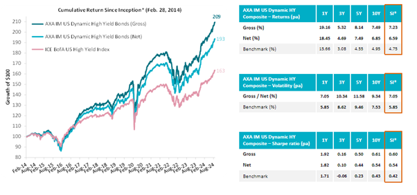 Fonte: AXA IM, 30 settembre 2024. Il benchmark della strategia è l’indice ICE BofA US High Yield. *Data di lancio del composito: 28 febbraio 2014. La performance indicata al netto delle commissioni è calcolata a seguito della deduzione di tutte le commissioni di gestione. I rendimenti possono aumentare o diminuire in ragione di fluttuazioni valutarie. Non è possibile garantire che la strategia avrà successo o raggiungerà gli obiettivi prefissati. A fini esclusivamente illustrativi.